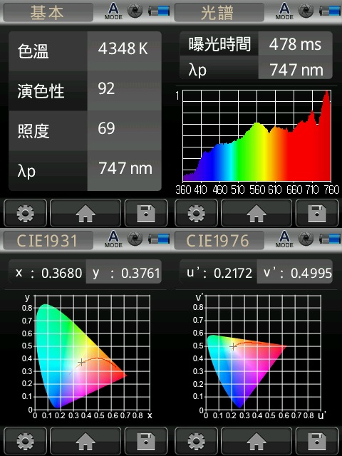 在Simple(簡要)模式下,直接讀取CCT(相關(guān)色溫)、CRI(顯色指數(shù))、LUX(照度)、λP(主峰波長)。