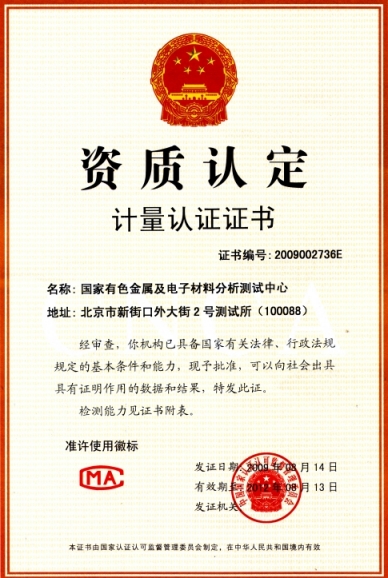 國家級資質(zhì)認(rèn)定計(jì)量認(rèn)證證書,CMA 2009000386Z;