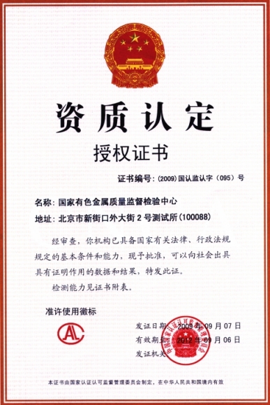 有色金屬標(biāo)準(zhǔn)樣品定點(diǎn)研制單位,YSRK07-2009;