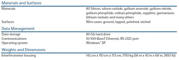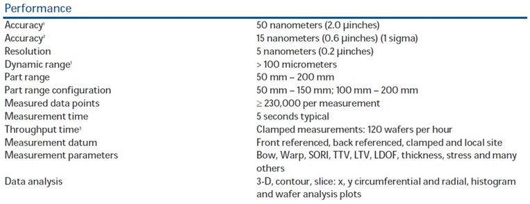 UltraSort is an automated wafer flatness analysis system that includes cassette-tocassette wafer handling with user configurable sorting capability. This Class 100 cleanroom compliant system integrates a grazing-incidence interferometer with industry standard robotic handling. The UltraSort can be configured to measure wafer sizes from 2 inches to 8 inches in diameter, and is well suited for a variety of different materials including gallium arsenide, sapphire, quartz, germanium, silicon and many others.